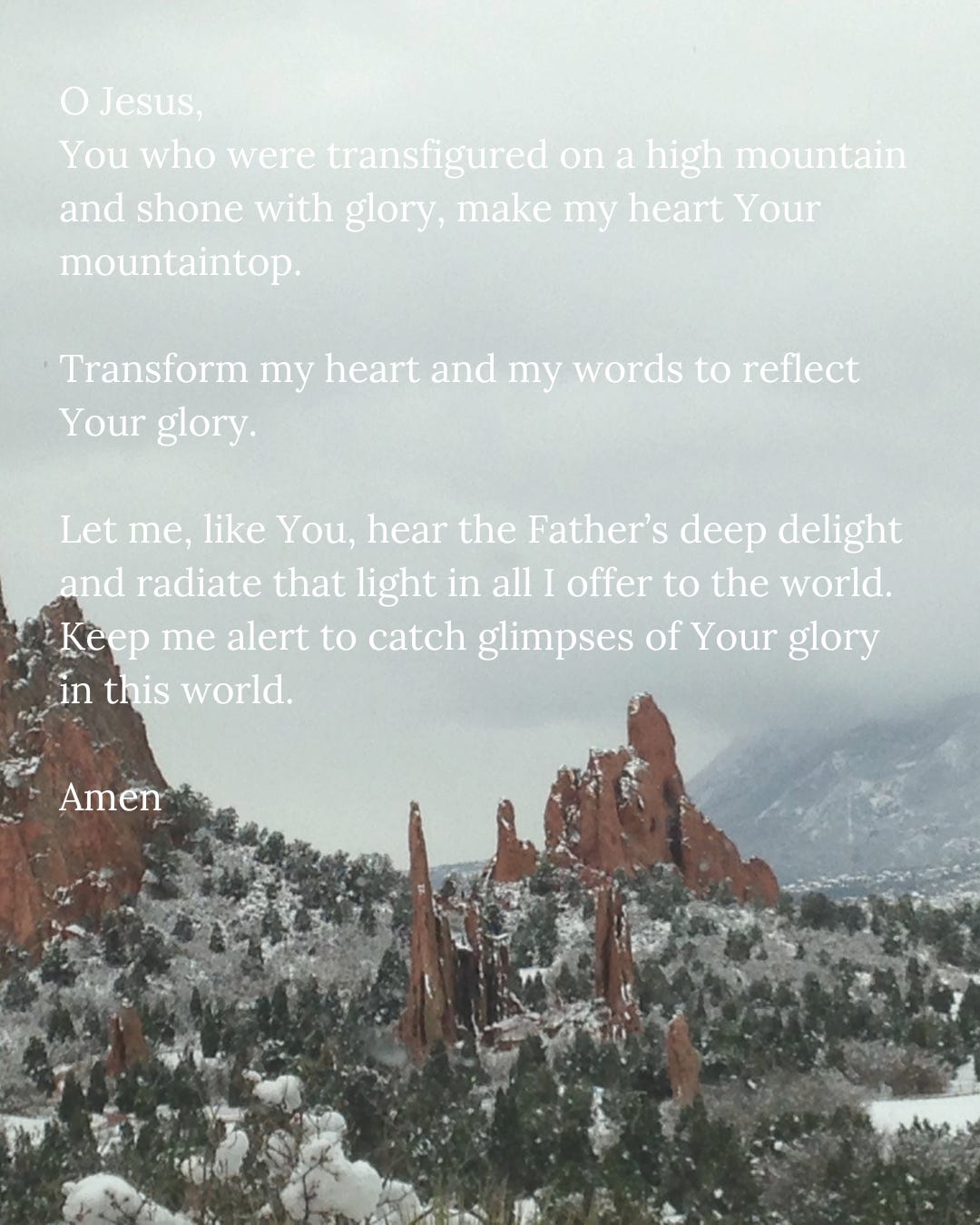 O Jesus, You who were transfigured on a high mountain and shone with glory, make my heart Your mountaintop. Transform my heart and my words to reflect Your glory. Let me, like You, hear the Father’s deep delight and radiate that light in all I offer to the world. Keep me alert to catch glimpses of Your glory in this world.